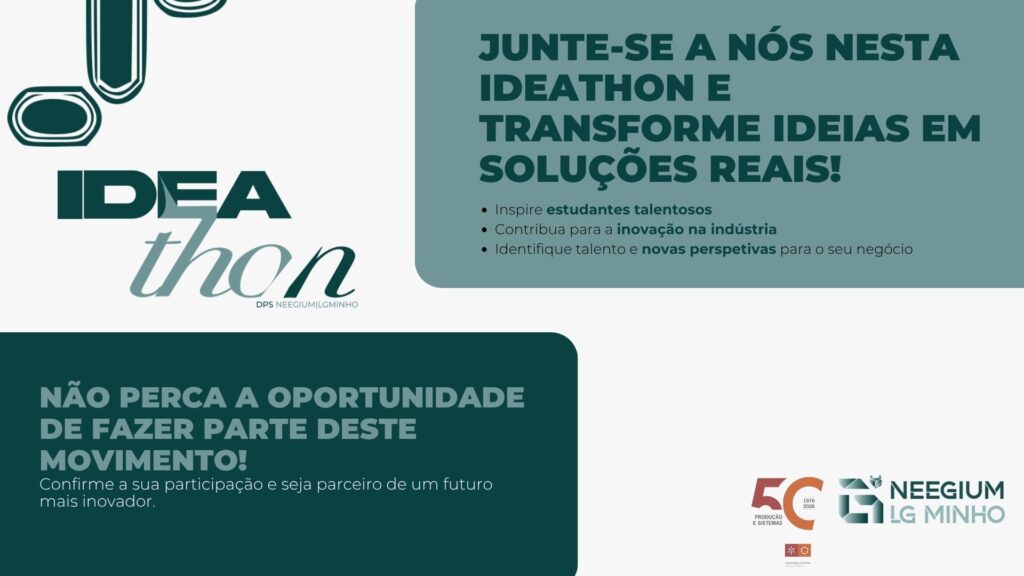 Temos o prazer de convidar as empresas parceiras do Departamento de Produção e Sistemas a participar no IDEATHON 2026, que terá lugar no dia 23 de setembro, na Universidade do Minho – Campus de Azurém, em Guimarães.